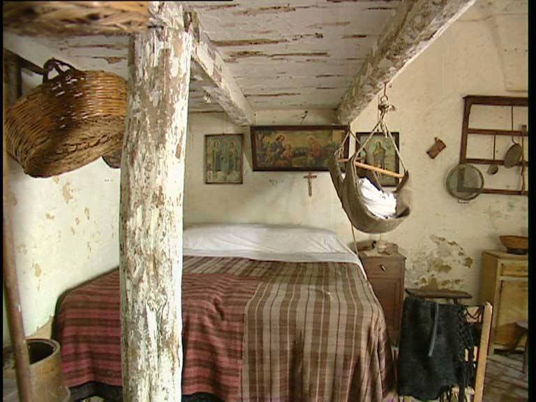 Volgendo lo sguardo al rimanente della casa, ecco in prossimità dell'alcova il telaio, dove la massaia o le figlie alternativamente siedono e fabbricano il rigatino di filo per el proprie vesti, o il fustagno per gli uomini, o più frequentemente la tela, sia l'ordinaria per le lenzuola e le camicie e le mutande dell'uso giornaliero, sia quella finissima. Di faccia al telaio un canterano, con sopra qualche boccia di vetro, qualche ninnolo. Più in la del canterano una tavola da mensa, quadra, salda, con largo e lungo cassetto, e presso o al di sopra di essa un armadio incassato nella parete, privo di sportelli. dove sono disposte le rustiche stoviglie, pendente dal muro troviamo la tavola da spianare (scanaturi) per fare il pane e le lasagne.